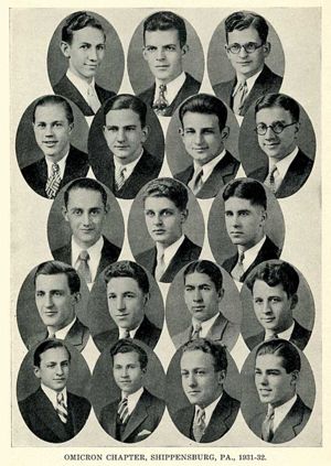 The guiding force in the establishment of Omicron Chapter was Dr. Simon Shearer. This well-liked professor was the chapter's first advisor and served in that capacity until World War II when the chapter became temporarily inactive.The first charter member of Omicron Chapter was President Lehman, but dies of a heart attack six months after the chartering. Omicron Chapter then inducted its first Honorary Brother, newly-appointed President Rowland, at its first Founder's Day Anniversary Celebration. An annual publication called the Epistolin was produced in the early years. There are currently four buildings on campus named after Brothers.