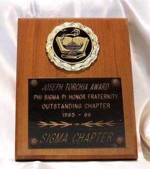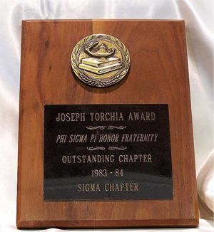 The Joseph Torchia Outstanding Chapter Award is the most prestigious national award which can be bestowed upon an undergraduate chapter. The Outstanding Chapter Award was originally established in 1957, with one award being given every two years. Since 1966, the award has been given on an annual basis. Modifications were made to the criteria in 1970 to allow for up to three chapters per year to win the award, and it was renamed to honor Mr. Torchia for his outstanding contributions, years of service, and dedication to Phi Sigma Pi. There are no longer restrictions on how many awards may be given out each year.