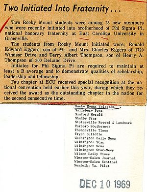 Ronald Eggers (born DD MMM YYYY) is an Alumni Member of Tau Chapter (T 666) at East Carolina University. Ronald was inducted as a part of the Fall 1969 Pledge Class.